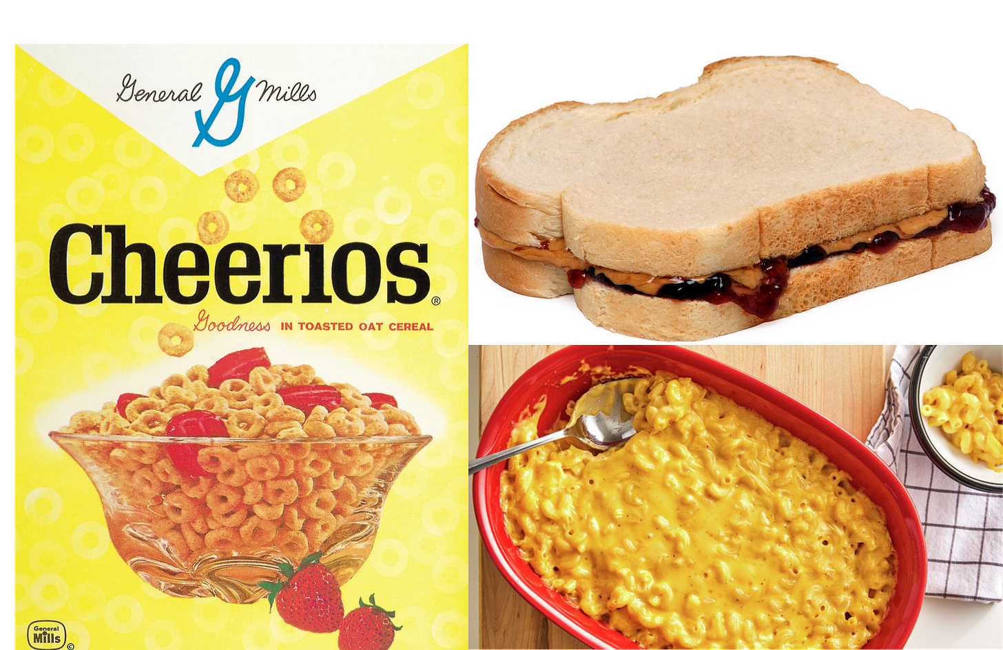 My mom was always there for us with food and comfort. We probably drove her nuts because she raised us by herself (my dad was a long-haul truck driver). I doubt she knew where we were but life was different … kids just disappeared for hours during the day and came home when mom called us for dinner (not on the phone, she literally yelled our names.) Breakfast was a bowl of cereal. Cheerios were my favorite, with spoonfuls of sugar on top. Lunch was peanut butter and jelly on white bread. Dinner may have been macaroni and cheese.