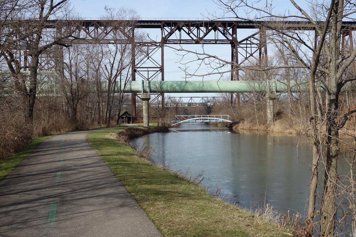 The canal at the end of Pikes Avenue really is the famous Ohio & Erie canal. We were told to stay away from it. Of course, that made us want to go there even more. It was a barrier between our neighborhood and what seemed like a very wild forest on the other side. Unless we wanted to swim across, which we didn’t, that area on the other side was a far away land. The bridge to cross was a long walk, all the way out to Manchester Road, which was a major highway. We didn’t want to go there. In the other direction, about the same distance, was a railroad trestle bridge. That was even more dangerous in our minds but much more interesting. And less likely to be found out.